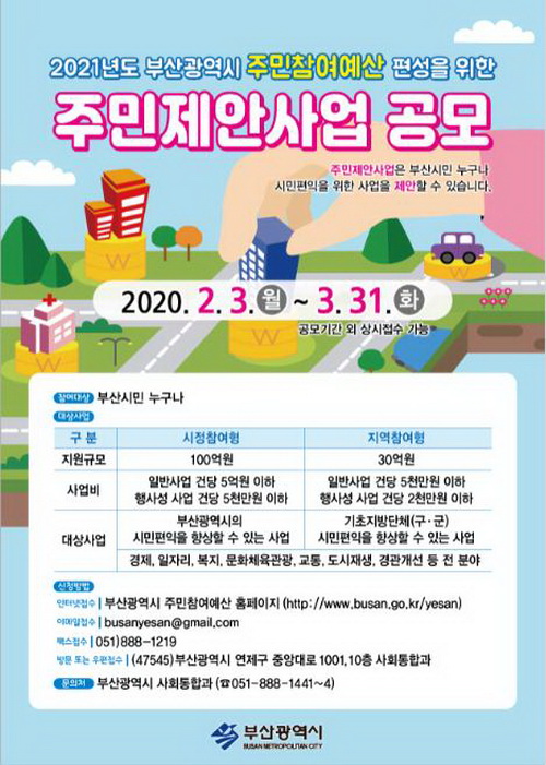 [부산=환경일보] 권영길 기자 = 부산시는 민선7기의 안정적인 주민참여예산제도 추진과 주민의 실질적인 참여와 소통을 위해 3대 분야 29개의 세부사업을 발표하고, 2021년도 예산에 반영할 주민참여예산 제도 제안사업을 공모한다.