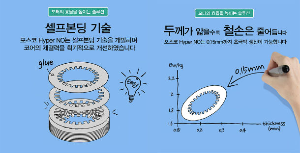 포스코 Hyper NO는 기존 전기강판 대비 에너지 손실이 30% 낮고 0.15mm 두께의 초극박 생산이 가능하다. 여기에 전자기적 특성을 저하시키지 않는 포스코 고유의 코팅기술을 적용해 에너지 효율을 10% 이상 높였다. 모터 효율을 획기적으로 높인 Hyper NO는 전기차 배터리 소재를 생산하는 포스코케미칼과 함께 향후 시너지 효과를 낼 것으로 기대된다.