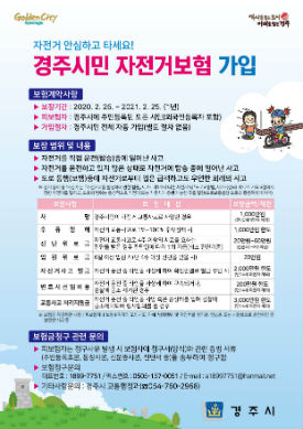 이번에 가입한 자전거보험은 경주시에 주민등록을 두고 있는 시민(외국인 포함)이면 별도의 절차와 조건 없이 자동 가입되며, 경주시 관내뿐 아니라 타 지역에서의 사고도 보험 혜택을 받을 수 있다.