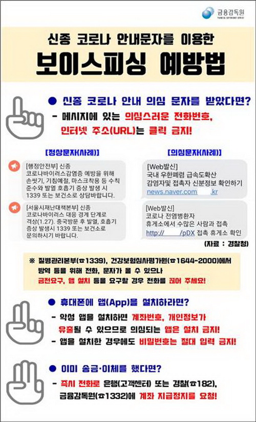 금융감독원이 제공한 자료에 따르면 지난 2월15일 기준으로 스미싱 문자의 누적건수는 1만여건에 이르며 전화로 코로나19 확진자 등을 사칭해 “나 확진자인데, 당신 식당 갔었다”며 자영업을 하는 업소 등에 금전을 요구하는 보이스피싱도 최근 들어 증가하고 있다.