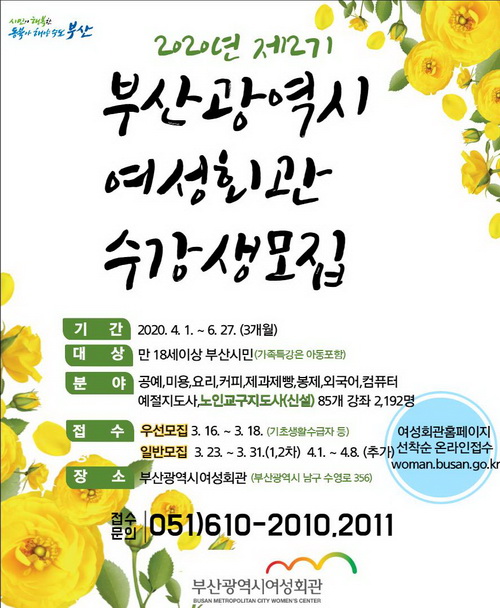 수강신청은 부산시 여성회관 홈페이지에서 할 수 있으며, 접수는 선착순으로 마감된다.