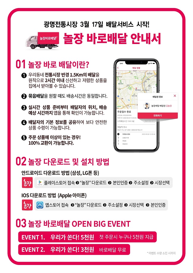 아울러 광명시는 ‘놀장’ 운영 기념으로 선착순 1,000명에게 5,000원의 쿠폰과 2,000명에게 배달수수료 3,0000원 무료 이벤트를 진행할 예정이다. 광명전통시장 배달앱 ‘놀장’에 대한 문의사항은 광명전통시장 조합사무실 또는 광명시 지역경제과로 문의하면 된다.