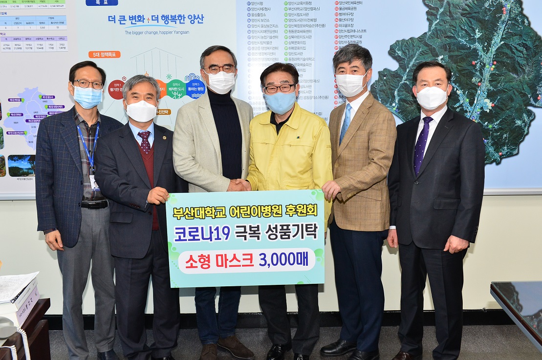 [양산=환경일보] 최창렬 기자 = 부산대학교어린이병원 후원회는 19일 시장 집무실을 방문해 코로나19 취약계층 아동에게 전달에 달라며 소형 마스크 3,000매를 기탁했다.