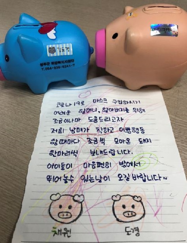 특히, 마스크 구매에 어려움을 겪고 있는 할머니, 할아버지를 도와달라며 쓴 손 편지와 어린남매(채원, 도경)가 착한 일 할 때마다 모은 돼지저금통(102,690원)을 기탁한 엄마가 주위를 훈훈하게 했다.