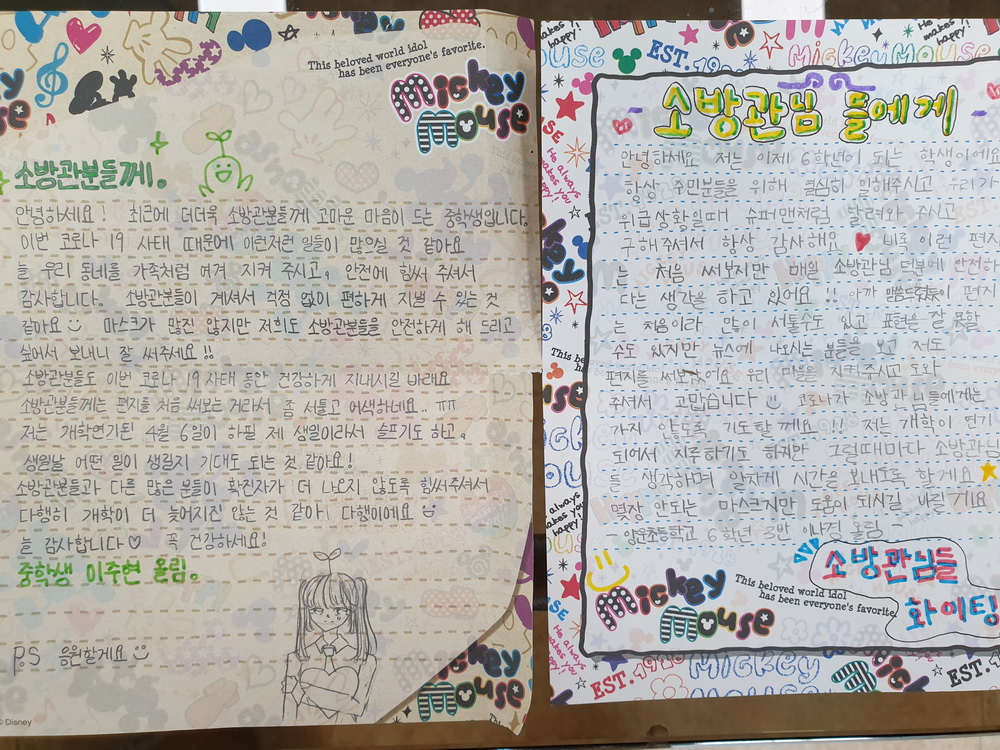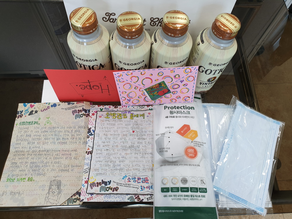 학생들의 편지에는 “항상 주민분들을 위해 열심히 일해주시고 우리가 위급상황일 때 슈퍼맨처럼 달려와 구해주셔서 감사해요, 마스크가 많진 않지만 저희도 소방관분들을 안전하게 해드리고 싶어 보내니 잘 써주세요!”라고 적혀 있었다.