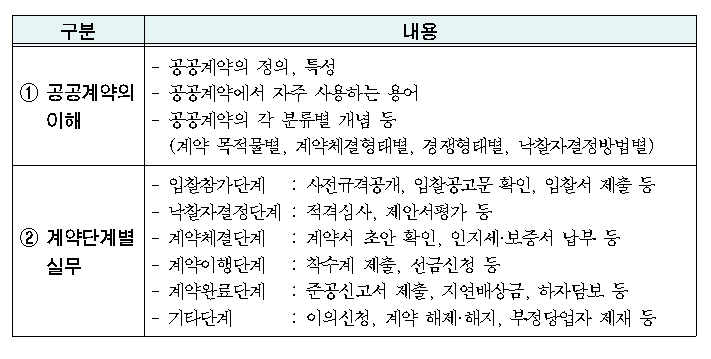 매뉴얼은 공공계약의 특성을 이해할 수 있는 기본적인 내용과 입찰서 제출, 적격심사, 계약체결 등 기업이 계약의 각 절차를 이행하기 위해 반드시 확인해야 하는 계약단계별 실무로 구성된다.
