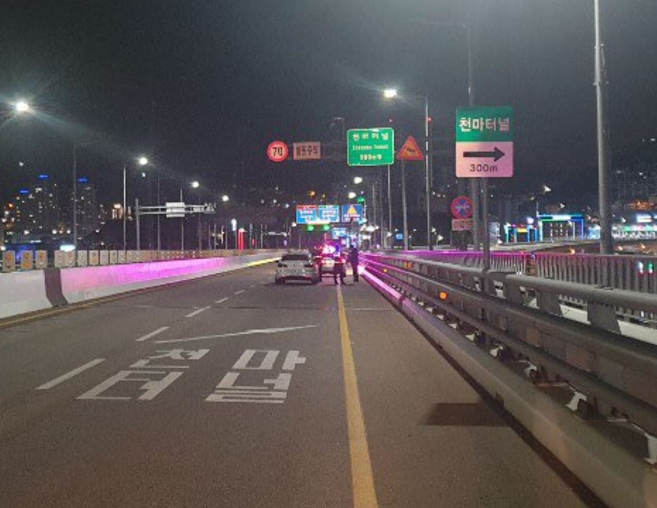 [부산=환경일보] 권영길 기자 = 부산시 남부경찰서는 5월14일 새벽 0시39분경 광안대교 상판을 지그재그로 운행하는 음주차량이 있다는 시민의 신고를 접수하고 현장에 출동한 순찰차량의 정지요청에 불응하고 도주하던 A씨(남, 40대)의 폭스바겐차량을 추적해 천마산터널 부근에서 시민의 적극적인 도움으로 A씨를 도로교통법상 음주운전 현행범으로 검거했다고 밝혔다.