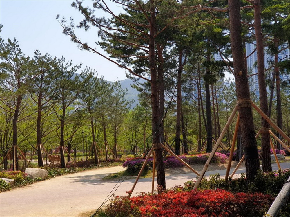 '소나무숲'은 기존 소나무 군락지에 복층 식재를 통해 솔숲을 더 울창하게 하고 소나무 사이 야자매트 길을 조성해 솔 향기 가득한 건강한 소나무 숲길을 조성했다.