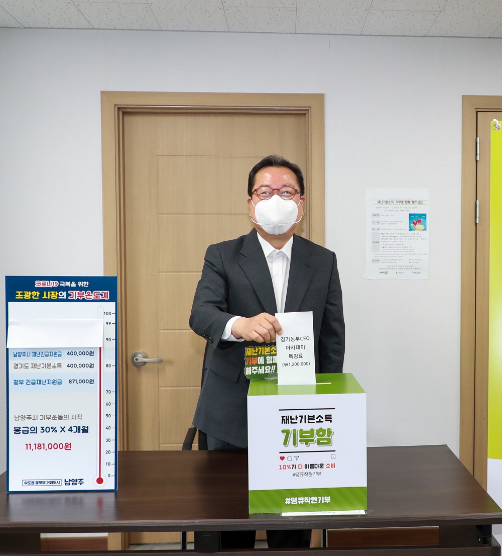 25일 금곡양정행정복지센터를 방문한 조광한 시장은 경기동부CEO아카데미에서 3차례에 걸친 특강 후 받은 사례금 120만원을 코로나19로 어려움에 처한 시민들을 위해 전액 쾌척하며 기부 행진을 이어갔다.