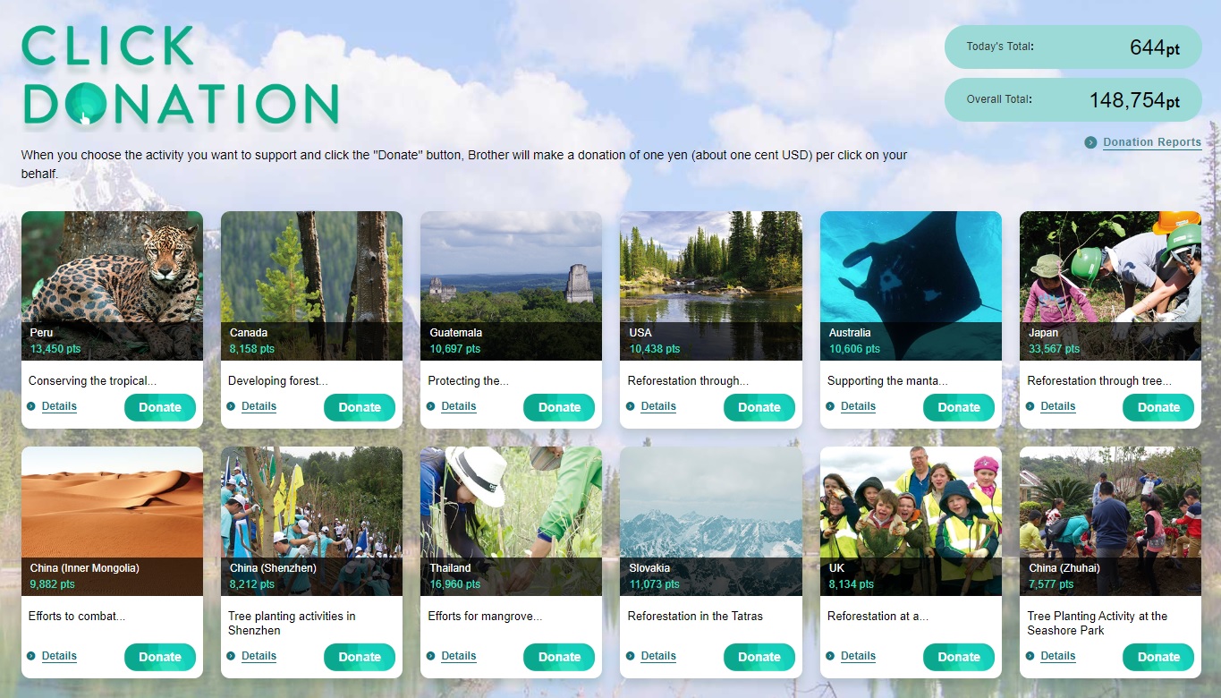 독일 디자인 어워드는 특히 ‘지구를 위한 클릭(Click for the Earth)’이라는 이름의 기부 캠페인에 주목했다. 어워드 심사위원단은 “사람들이 클릭을 할 때마다 브라더는 나무를 심고 산림을 조성하는 데에 1센트(한화 약 12원)를 기부하는 방식을 채택했다”며 “이는 사람들로부터 호기심과 관심을 불러일으키고 환경보호에 대한 인식을 높일 수 있는 흥미로운 방식”이라고 평가했다.