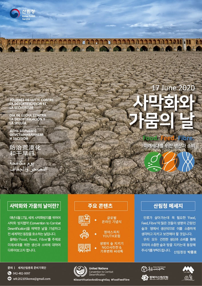 산림청(청장 박종호)은 세계사막화 및 가뭄의 날(6.17)을 기념하기 위해 유엔사막화방지협약(UNCCD) 사무국과 함께 지구촌 숲 지키기 사진전 및 기후변화 씨네톡을 개최한다.
