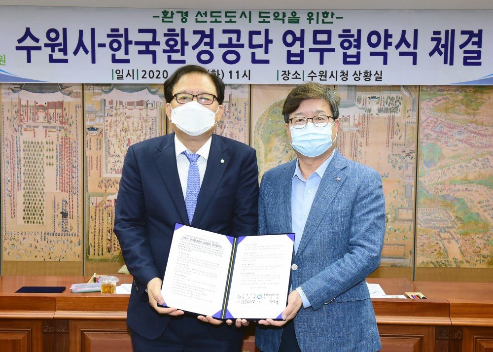 이날 시청 상황실에서 열린 협약식에는 염태영 수원시장 및 시 환경국 산하 공무원을 비롯해 장준영 한국환경공단 이사장 등 공단 관계자 5명이 참석했다.