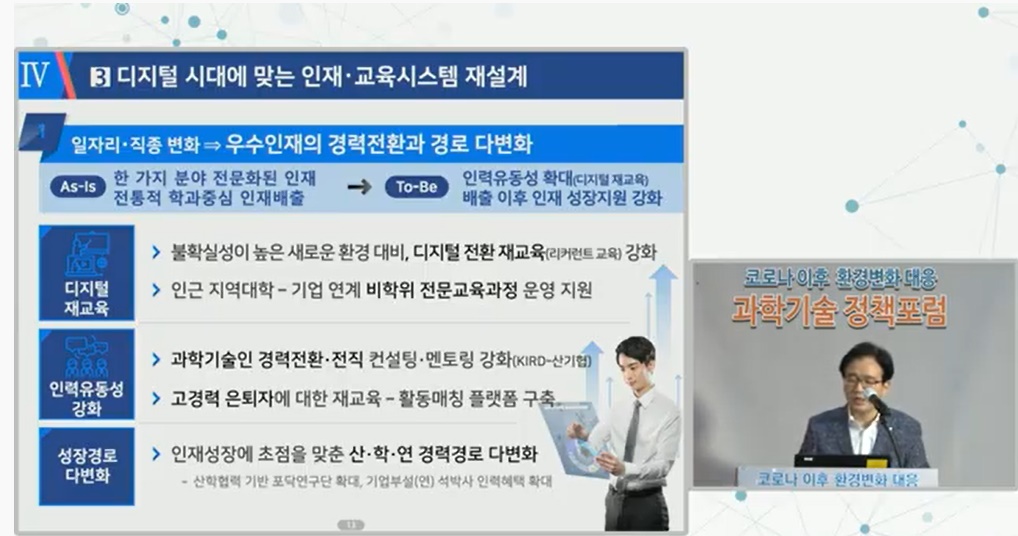 이어 과기부의 주요 5개 정책 방향으로 ▷미래 선점투자 및 연구·개발혁신 ▷산업 디지털 전환 대응·자생력 강화 ▷인재‧교육시스템 재설계 ▷과학기술 중심 국가 위기대응 ▷K-방역의 기회 활용, 과학기술 글로벌 리더국가 도약을 중심으로 발표를 진행했다.