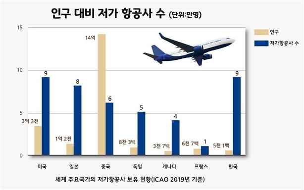 ICAO에 따르면 한국의 LCC는 9곳으로 6배나 더 많은 인구 3억3264만명에 달하는 미국과 같은 숫자다. 여행수요가 폭발적으로 증가하고 있는 중국(13억9402만명)에 비해서도 3개 업체가 많은 수준이다.