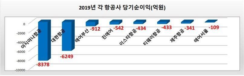 지난 5월18일 항공업계에 따르면 상장 기준 대한항공, 아시아나항공, 제주항공, 티웨이항공, 진에어, 에어부산 등 6개 항공사는 모두 영업손실을 기록했다. 이들 항공사의 영업적자만 총 4200억원대, 당기순손실 규모는 1조5000억원에 달한다.
