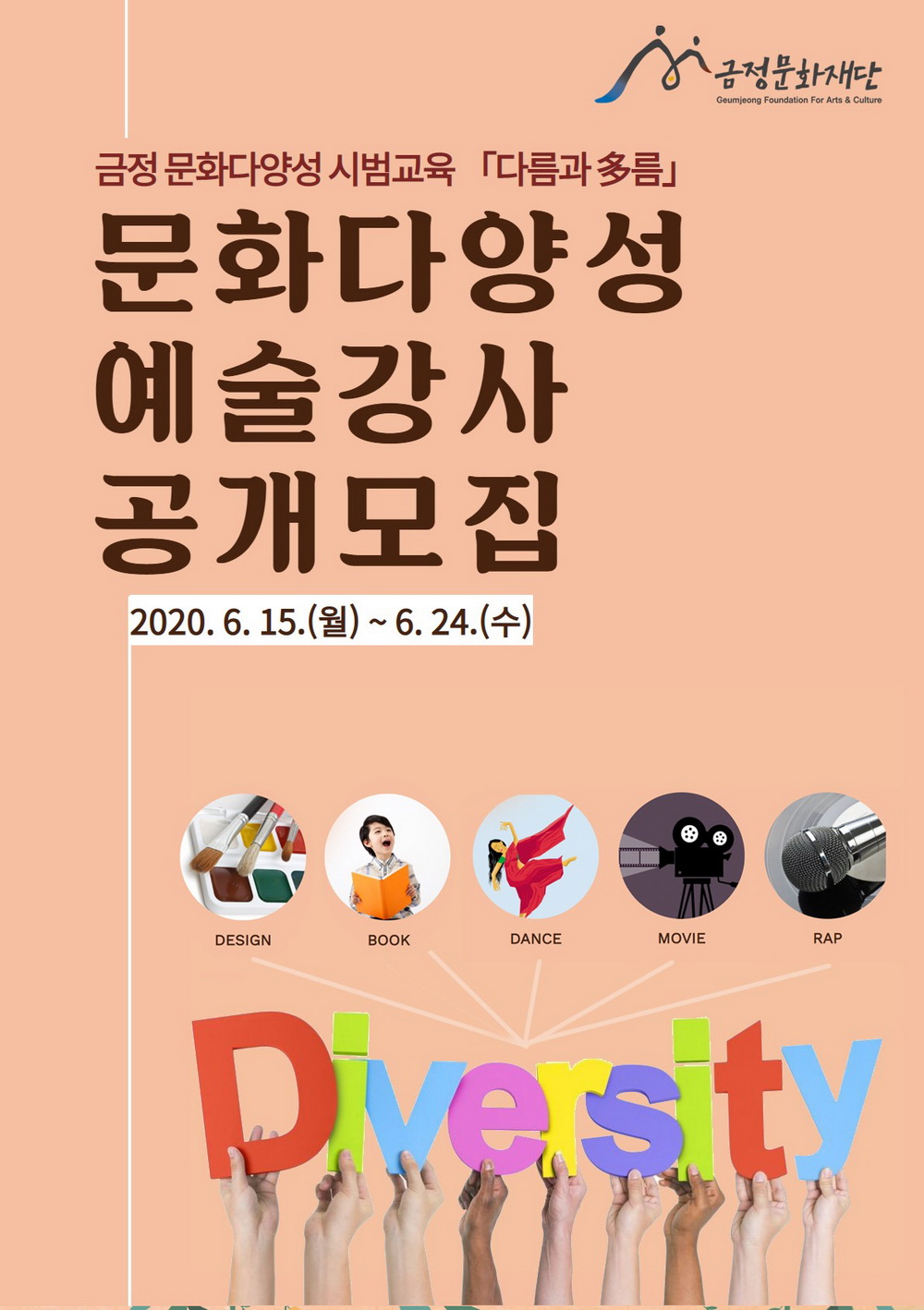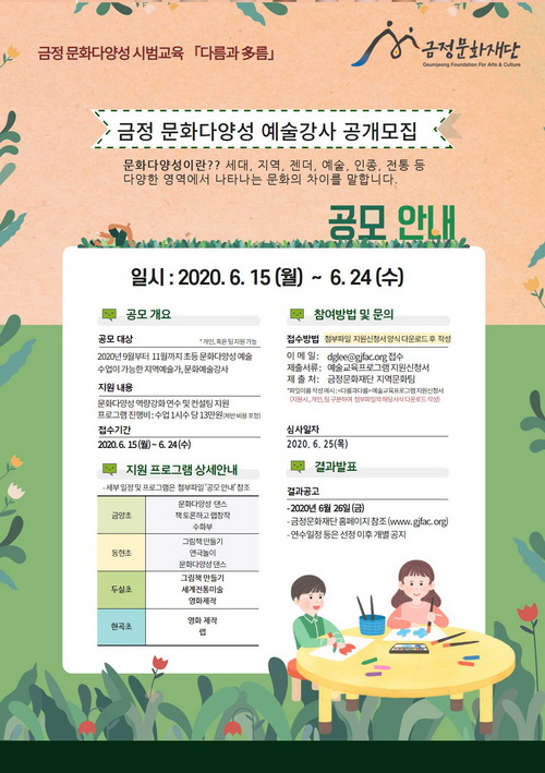 ‘다름과 多름’의 운영을 위해 금정문화재단은 4개 초등학교의 동아리반에서 문화다양성 예술교육을 담당할 예술강사를 오는 6월24일까지 모집한다.