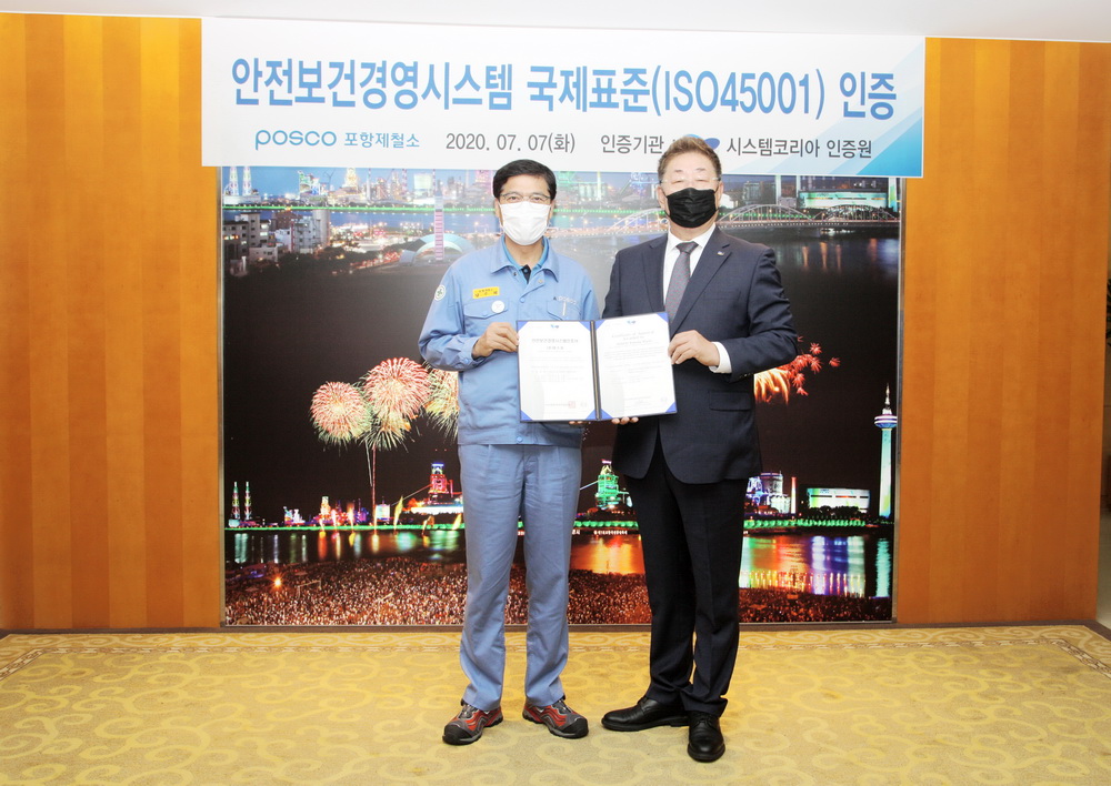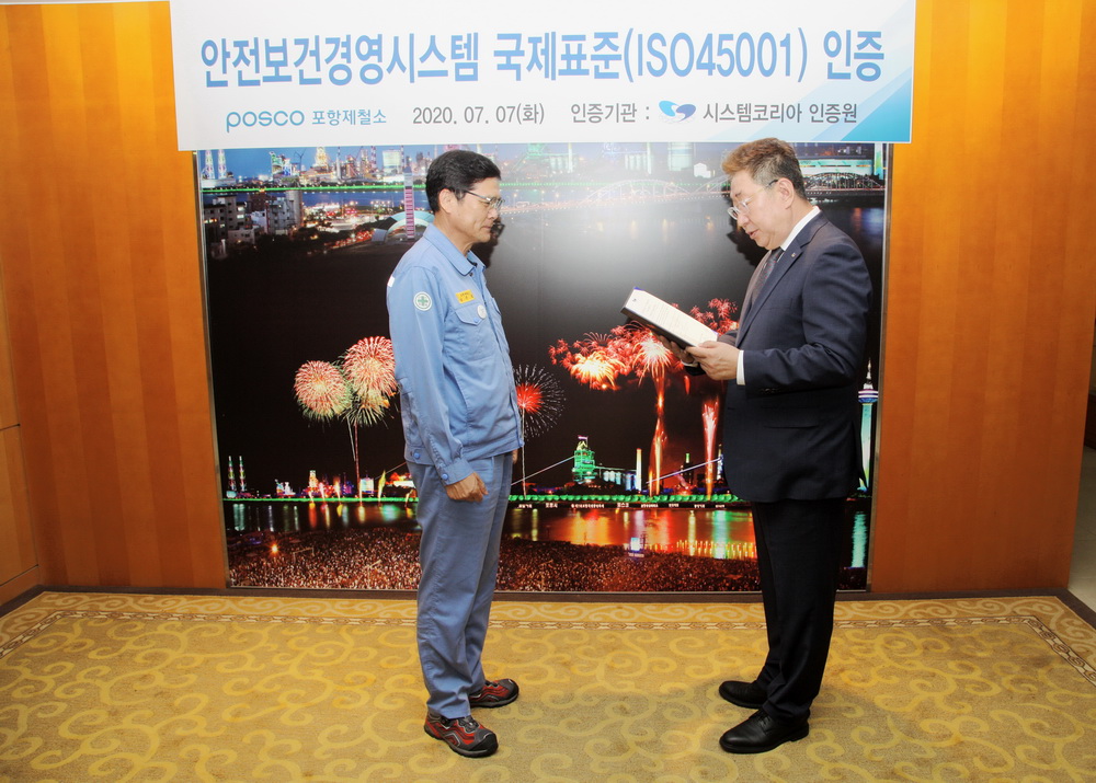 한편 포스코는 올해 5월 초에 시스템코리아인증원(주)으로부터 기존 OHSAS18001:2017을 ISO45001:2018로의 전환심사를 받아서 지난 6월12일에 ISO45001:2018 인증을 획득했다.