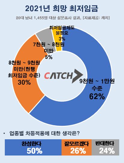 취업 정보사이트 캐치가 ‘희망 최저임금’ 조사 결과를 발표했다. 이번 조사는 20대 성인남녀 1455명이 참여했다.