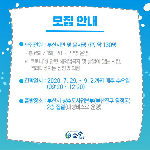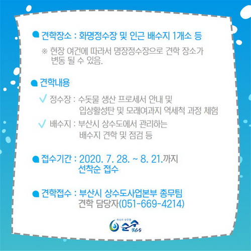 상수도 시설체험단은 오는 9월2일까지 매주 수요일마다 운영이 되고, 부산시민이면 누구나 무료로 참여할 수 있으며, 7월28일부터 8월21일까지 부산시상수도사업본부 총무팀 견학담장자에게 전화로 신청하면 된다.