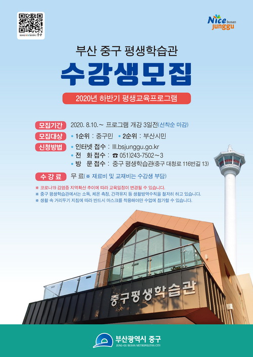 [부산=환경일보] 권영길 기자 = 부산시 중구평생학습관(이하 ‘평생학습관’)은 ‘2020년 하반기 평생교육프로그램’ 수강생을 8월10일부터 개강 3일 전까지 선착순으로 모집한다.
