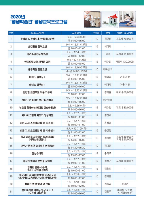 이번에 평생학습관에서 2020년 하반기에 운영하는 교육프로그램은 무료로 진행되지만, 재료비·교재비는 수강생이 부담을 해야 한다.