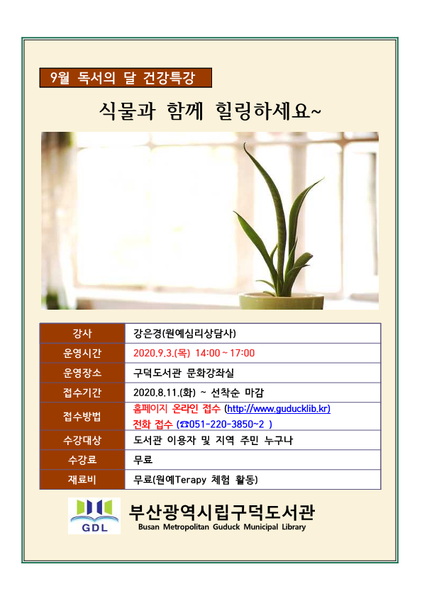 [부산=환경일보] 권영길 기자 = 부산시 시립구덕도서관은 오는 9월3일 오후 2시 도서관 지하 1층 문화강좌실에서 ‘식물과 함께 힐링하세요’를 주제로 건강특강을 개최한다.