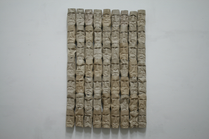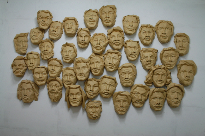 작가는 재료를 사용함에 있어서도 가급적으로 하찮거나 이미 폐기된 종이 재료를 주로 사용한다. 대부분 산업 부산물들이거나 한번 사용하고 버려지는 것들이다. 이번 전시에서 사용된 재료들 역시 포장지, 혹은 이미 사용한 서류봉투 같은 갈색 종이류이다.