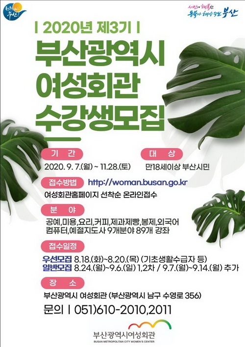 수강신청은 부산시 여성회관 홈페이지에서 접수할 수 있으며 선착순으로 마감한다.