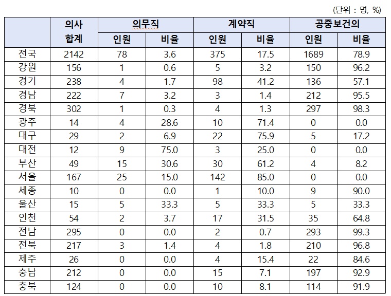 이들 1,660개 지역 공공보건의료기관에 근무하고 있는 의사 수는 총 2142명. 이 중 78.9%가 군 복무를 대체하고 있는 공중보건의사이다. 이에 반해 안정적으로 보건의료 서비스를 공급할 의무직 공무원은 3.6%에 불과했다. 계약직 의사도 17.5%에 그쳤다.
