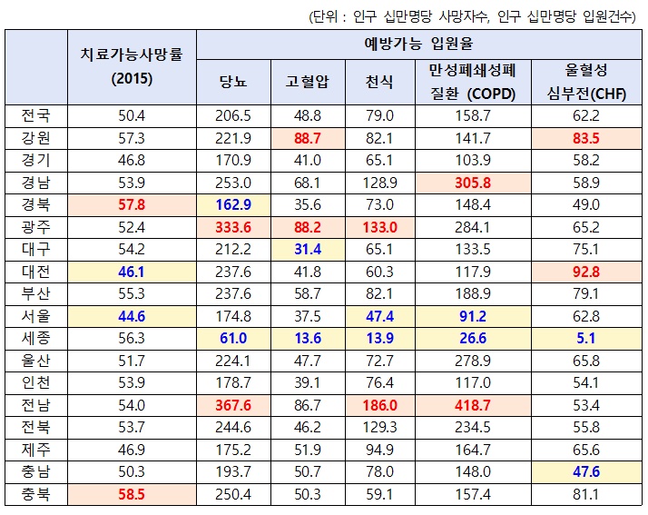 적절한 의료서비스가 제공됐다면 줄어들었을 사망률인 ‘치료가능 사망률’도 경북과 충북, 전남 등은 높게 나타났지만, 서울과 대전, 경기는 낮았다.