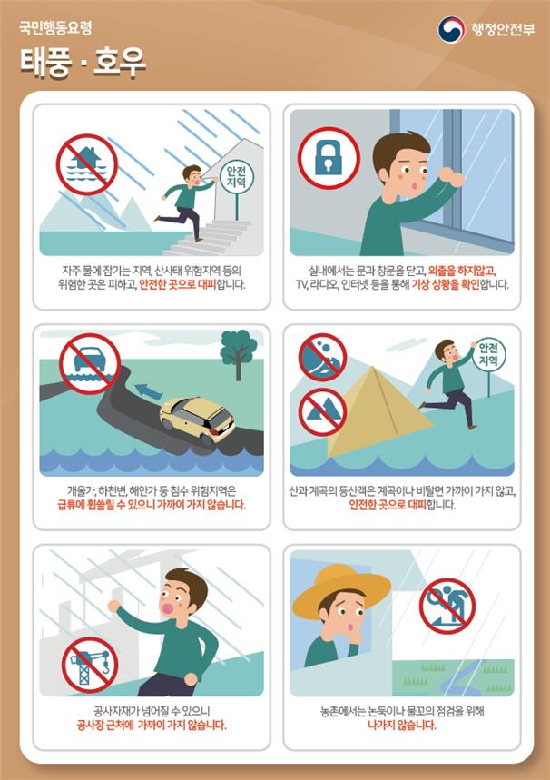 중대본부장(행정안전부 장관)은 ”모든 부처와 지방자치단체는 위기경보 심각단계에 상응하는 대책본부 운영 등 대응태세와 비상체계를 가동하고 인력‧장비‧물자 동원이 적시에 될 수 있도록 하는 한편 국민들께서도 태풍의 영향권에 들면 모든 야외 작업을 중지하고 외출을 자제하는 등 태풍시 행동요령을 준수하여 개인의 안전을 지켜주실 것“을 당부했다.