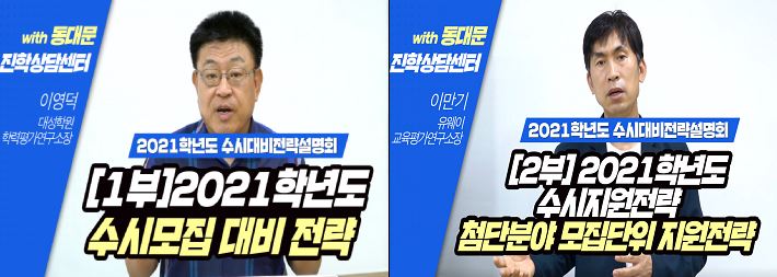 ‘2021학년도 대입 수시 지원 전략 설명회’는 동대문진학상담센터 누리집에서 볼 수 있으며, 이번 설명회로 해소되지 않는 입시에 대한 궁금증은 동대문진학상담센터를 통해 언제든지 해결할 수 있다.