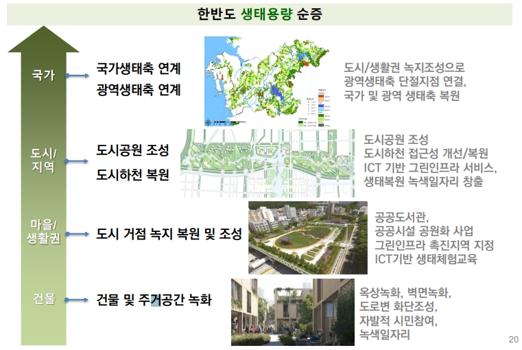 제5차 국가환경종합계획에는 지속 가능한 생태국가를 위한 핵심전략으로 국토 생태용량 확대를 제시하고 있다. 그린인프라를 활용해 우수한 생태계는 잘 보호하고, 훼손된 자연은 복원해야 한다. 이렇게 되면 국가 생태용량을 순증시켜 다양한 생태계서비스를 제공할 수 있다. 특히 인간의 이용에만 초점을 둔 토목사업은 생태적 가치에 대한 고려가 부족해 환경갈등을 유발하고 있다. 반면 건강한 생태계는 기후변화와 환경재해로부터 인명과 재산을 보호하고, 우리의 행복한 삶을 보장해 준다.