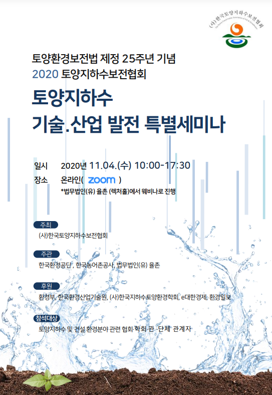 (사)한국토양지하수보전협회(회장 조명현)가 주최하고 한국환경공단 및 한국농어촌공사, 법무법인 율촌이 공동 주관하는 ‘2020 토양지하수 기술산업 발전 특별세미나’가 오는 11월4일 10시 온라인으로 개최된다.