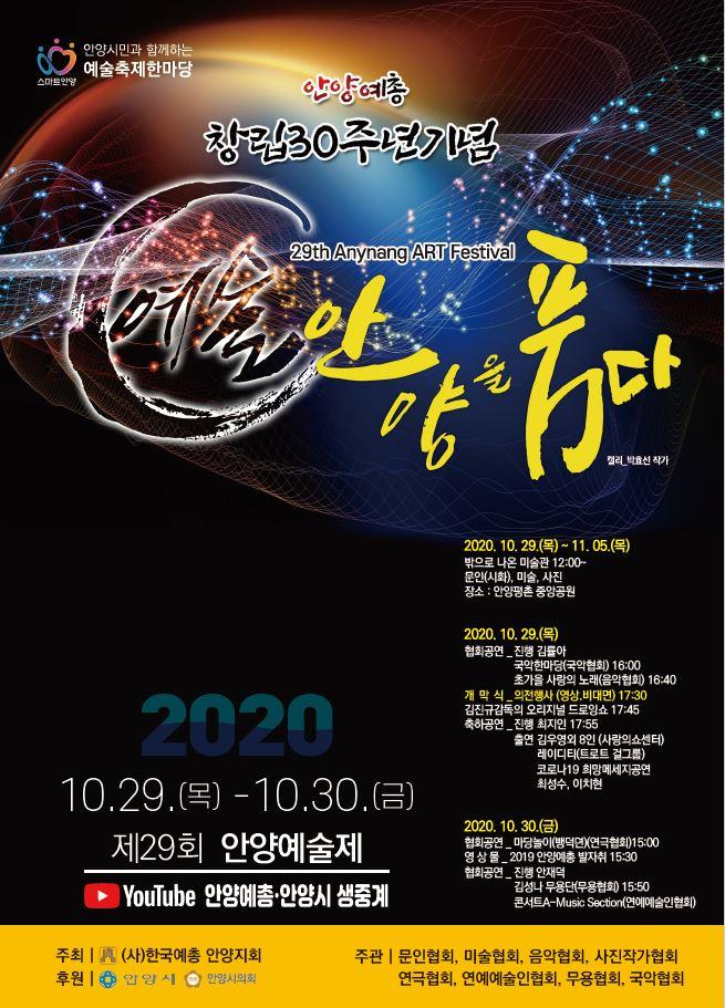 제29회 안양예술제 개막 공연은 “안양시”와 “안양예총” 유튜브 채널서 10월 29일 17:30분 생방송으로 시청 할 수 있다.