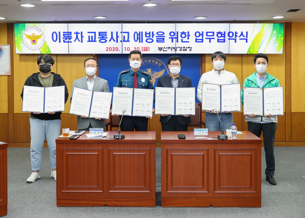 그러나 올바른 이륜차 문화를 조성하기 위해서는 관련 기관 및 배달대행업체의 협업이 필요함에 따라 이번에 부산경찰청은 지난 10월30일 경찰청에서 한국교통안전공단과 안전보건공단 및 배달대행업체 3사(생각대로·부릉·우아한청년들)와 ‘이륜차 교통사고 감소를 위한 업무협약(MOU)’을 체결식을 개최했다.