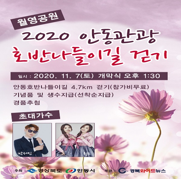 [안동=환경일보] 김희연 기자 = 안동시가 주최하고 경북와이드뉴스가 주관하는 ‘2020 안동 호반나들이길 걷기’ 행사가 오는 7일 오후 1시부터 월영공원 특설무대 및 호반나들이길 일원에서 개최된다.
