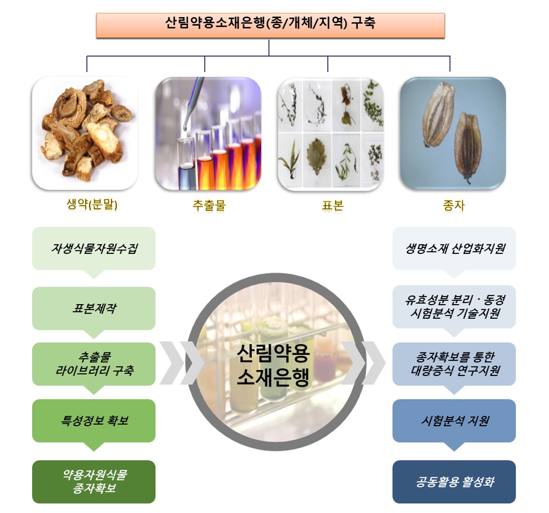 약용소재은행은 저온저장시설(-18℃, ±4℃), 표본실 등을 갖추고 있으며, 자생 약용식물을 대상으로 지역별·개체별·군락별·부위별 추출물부터 확증표본, 종자까지 통합적으로 수집·보존·관리하여 대량생산 연구 및 약용소재의 산업화를 지원한다.