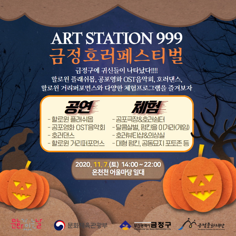 [부산=환경일보] 권영길 기자 = 부산시 금정구 금정문화재단은 2020년 문화가 있는 날 ‘Art Station 999’의 일환으로 11월7일 오후 2~9시 사이 온천천 어울마당 일대에서 ‘금정호러페스티벌’을 개최한다.