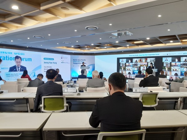 ‘제4차 아·태 환경장관포럼’의 첫날인 5일 진행된 ‘한국-아시아태평양 그린뉴딜 협력포럼(Korea-Asia Pacific Green New Deal Cooperation Forum)’에는 아시아·태평양 지역 40개국 기후리더들이 온·오프라인으로 참여했다. 포럼 현장인 수원컨벤션센터에도 각국 관계자 30여명이 모였다.