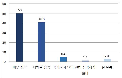 그 결과 우리나라 산업재해가 매우 심각하다는 응답은 50%, 대체로 심각하다는 응답은 40.8%이었다. 특히 기능·숙련직에서는 95.8%가 심각한 수준이라고 응답했다.