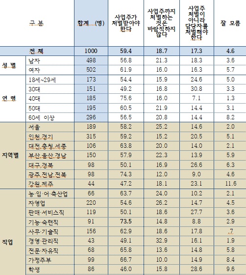 중대재해가 발생하면 사업주가 처벌받아야 한다는 응답은 59.4%로 국민 10명 중 6명이 사업주가 처벌받아야 한다고 응답했다. 사업주까지 처벌하는 것은 바람직하지 않다는 응답이 18.7%였고, 담당자가 처벌받아야 한다는 응답은 17%로 조사됐다. 최근 화정 아이파크 붕괴 사고를 당한 광주·전남북 지역 응답자들은 사업주가 처벌받아야 한다는 응답이 74.3%였다.