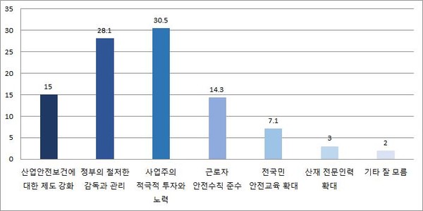 산재를 감소하기 위한 대책으로 사업주의 적극적인 투자와 노력이 필요하다는 응답이 30.5%로 1순위를 차지했다. 정부의 철저한 감독과 관리가 28.1%로 2순위로 나타났다. 산업안전보건제도 강화가 15%로 3순위를 차지했다. 50대 이상에서 사업주의 적극적인 투자와 노력이 필요하다는 응답은 37.2%로 높게 나타났고, 대구·경북 지역에서는 정부의 철저한 감독과 관리가 필요하다는 응답이 44.7%로 가장 높게 나타났다.