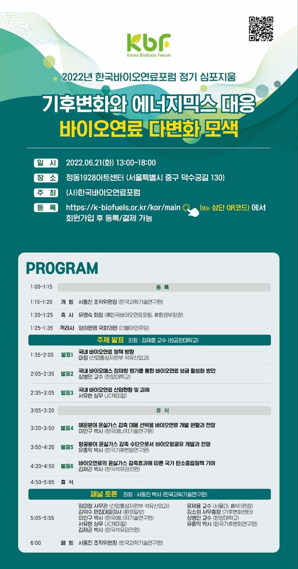 또한 산·학·연으로 구성된 5명의 전문가는 ‘국내 바이오매스 잠재량과 평가를 통한 바이오연료 보급 활성화 방안’, ‘국내 바이오연료 산업 현황과 과제’, ‘해운과 항공 분야의 바이오연료 개발 현황과 전망’, ‘바이오연료의 온실가스 감축 효과에 따른 국가 탄소중립 정책 기여’ 등의 발표를 진행한다.