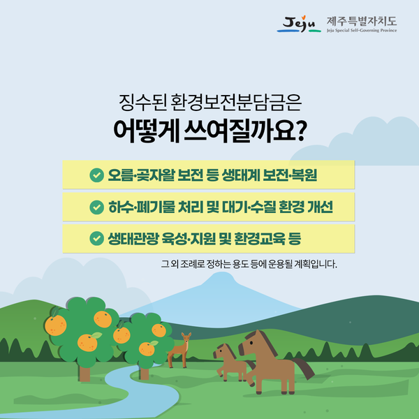 /자료제공=제주특별자치도 키워드 #제주특별자치도 #환경보전분담금 #유네스코 #환경 편집국 press@hkbs.co.kr 다른기사 보기 저작권자 © 환경일보 무단전재 및 재배포 금지 당신만 안 본 뉴스 청도군, ‘1회용품 줄이기’거리 캠페인 전개 경북교육청, 어린이놀이시설 관리 실태 점검 청도군, 친환경 생활문화 캠페인 펼쳐 [특집] 한국의 친환경 기술, 베트남 농업의 미래를 바꾼다 영농형 태양광, 농촌 소멸 막을 대안 될까? 안동시, 겨울철 재난 대비 대설 훈련 실시 천안 이랜드 물류센터 화재 이틀째 진화 청도군, ‘1회용품 줄이기’거리 캠페인 전개 댓글삭제 삭제한 댓글은 다시 복구할 수 없습니다. 그래도 삭제하시겠습니까? 비밀번호 닫기 기사 댓글 0 댓글 접기 로그인 후 이용 가능합니다. 댓글 내용입력 비회원 로그인 이름 비밀번호 댓글 내용입력 댓글쓰기 계정을 선택하시면 로그인·계정인증을 통해 댓글을 남기실 수 있습니다. 회원 로그인 비회원 글쓰기 이름 비밀번호 자동등록방지 로그인 옵션 창닫기 주요기사 배출권거래제 53% 기준 두고 환노위서 공방 ‘악취와의 전쟁’ 부산 강서구··· 관리 부실로 주민만 고통 해상풍력 시행령, 환경성 기준이 방향 결정 자연을 권리 주체로··· 국제 사례로 본 ‘생태문명 전환’의 길 “극한기후 시대, 히트펌프 기술이 돌파구 되나” [톡 쏘는 친환경 꿀팁㉙]‘지속가능 소비’가 주류··· 2025 친환경 실천 트렌드 10