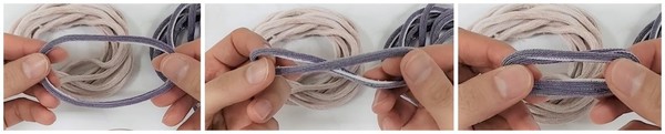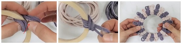 2. 우드링을 감싼 다음, 뒤쪽 고리에 넣고 당겨준다. 또는 화살표 방향에 넣고 당겨준다. 22줄 모두 같은 방법으로 묶어준다.