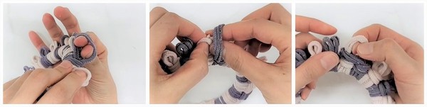 3. 보라색 고리에 엄지와 검지를 넣어, 보라색 고리 사이로 핑크 고리를 넣는다. 같은 방법으로 연결해 준다.