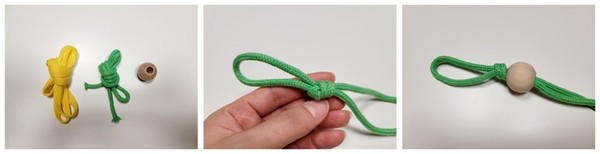 1. 안 쓰는 끈과 우드볼을 준비한다. 끈을 반으로 접고 고리를 만들어 묶어준 다음, 우드볼을 끼워준다.