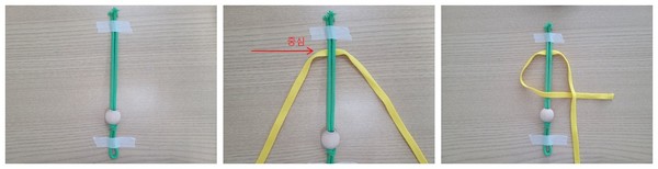 2. 끈의 양쪽 끝을 테이프로 고정한 다음, 노란색끈을 중심 맞춰 녹색끈 뒤에 둔다. 숫자 4모양으로 매듭을 만들어준다.