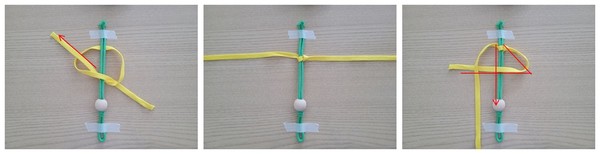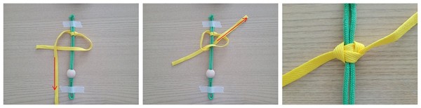 4. 거꾸로된 4모양에서 왼쪽 노란색끈을 고정된 녹색끈 뒤로 보내고, 오른쪽 4자 고리로 빼낸다. 평매듭이 완성된다. 같은 방법으로 2개 더 만든다.